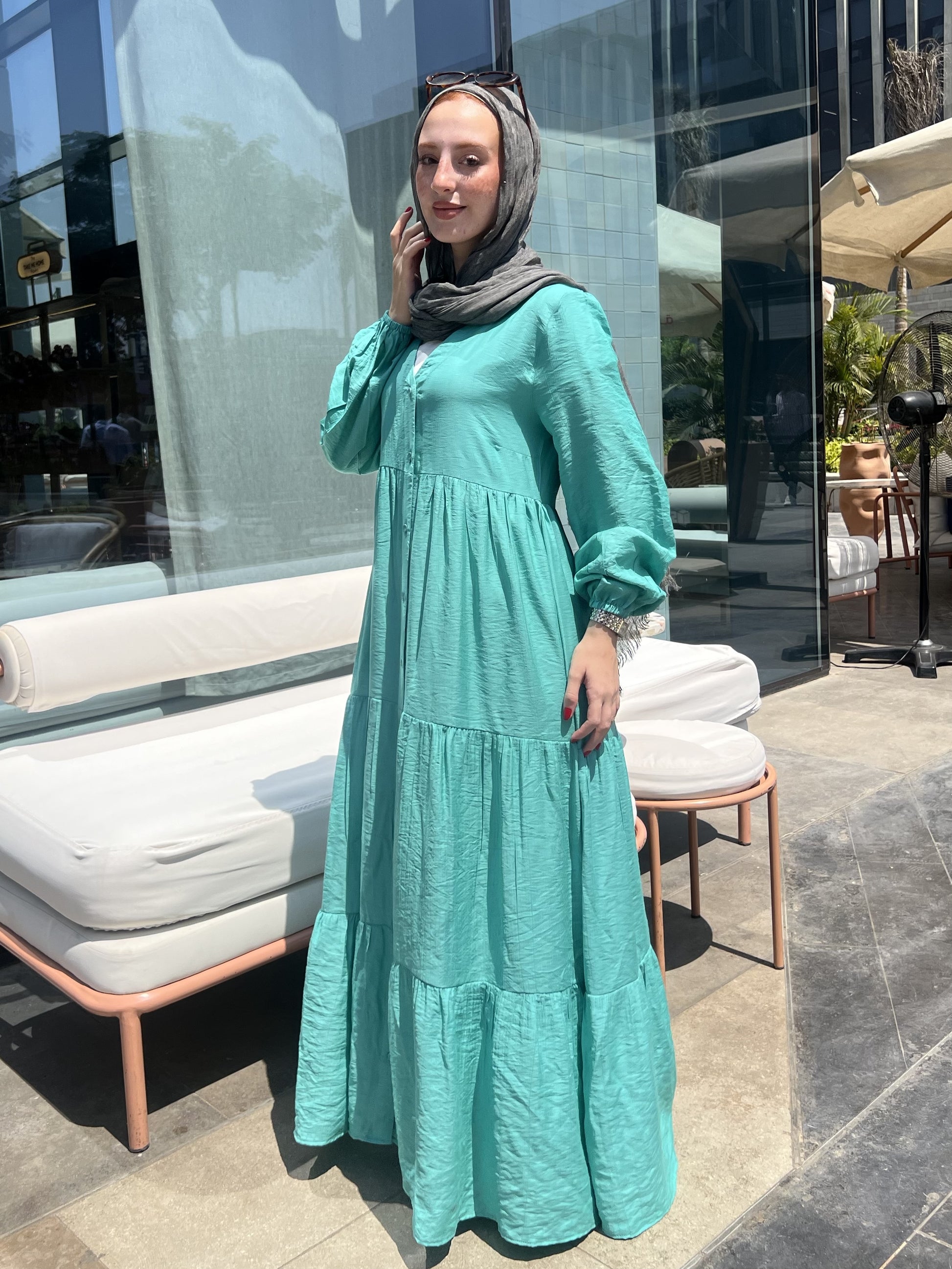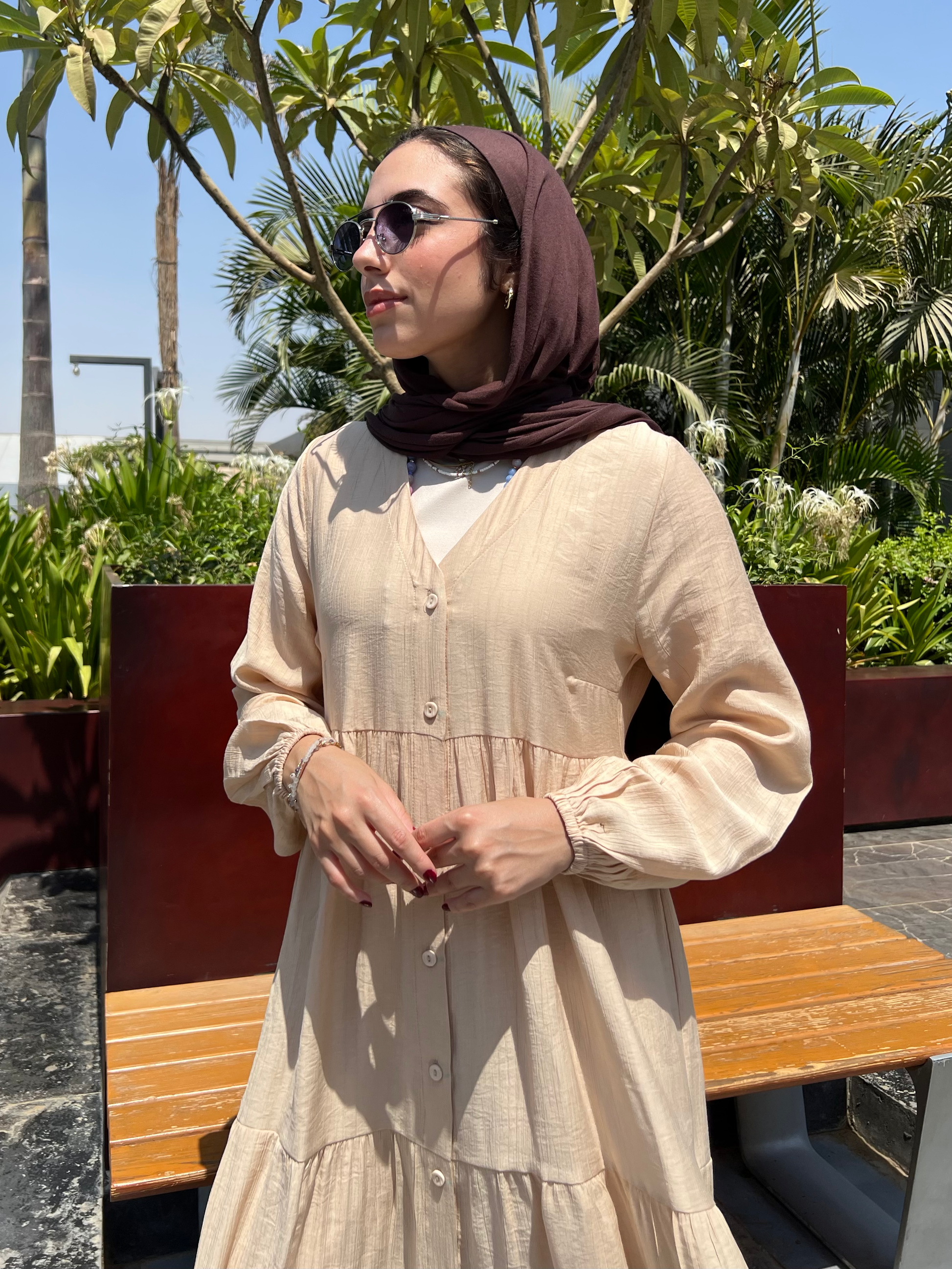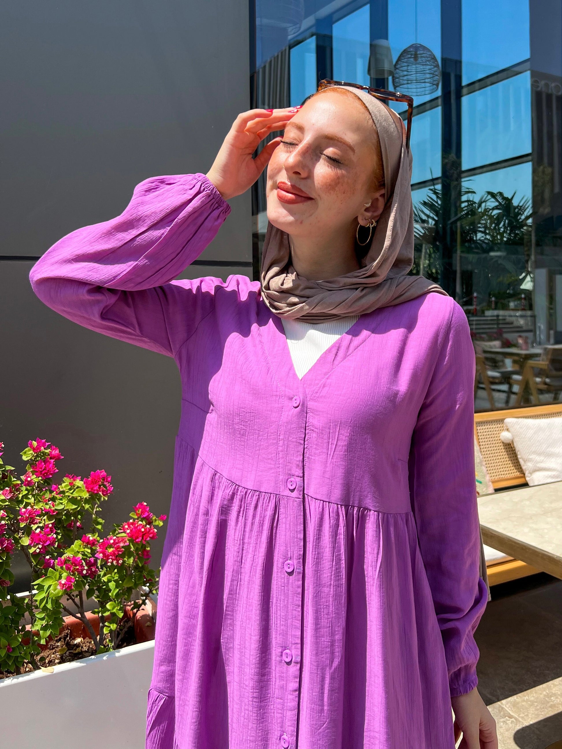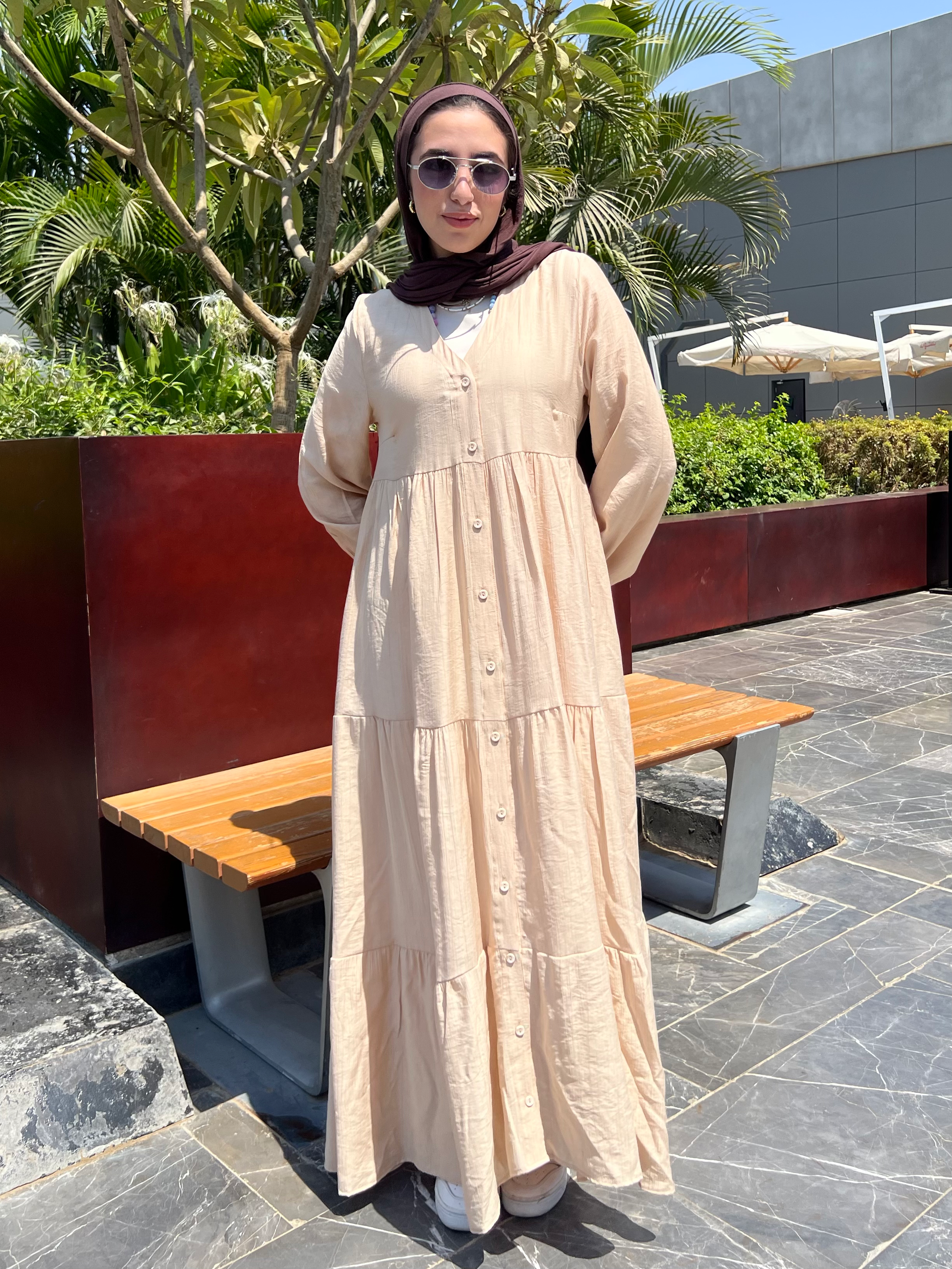التصميم: فستان كتان ناعم سادة بأزرار أمامية – يتلبس مفتوح أو مقفول.