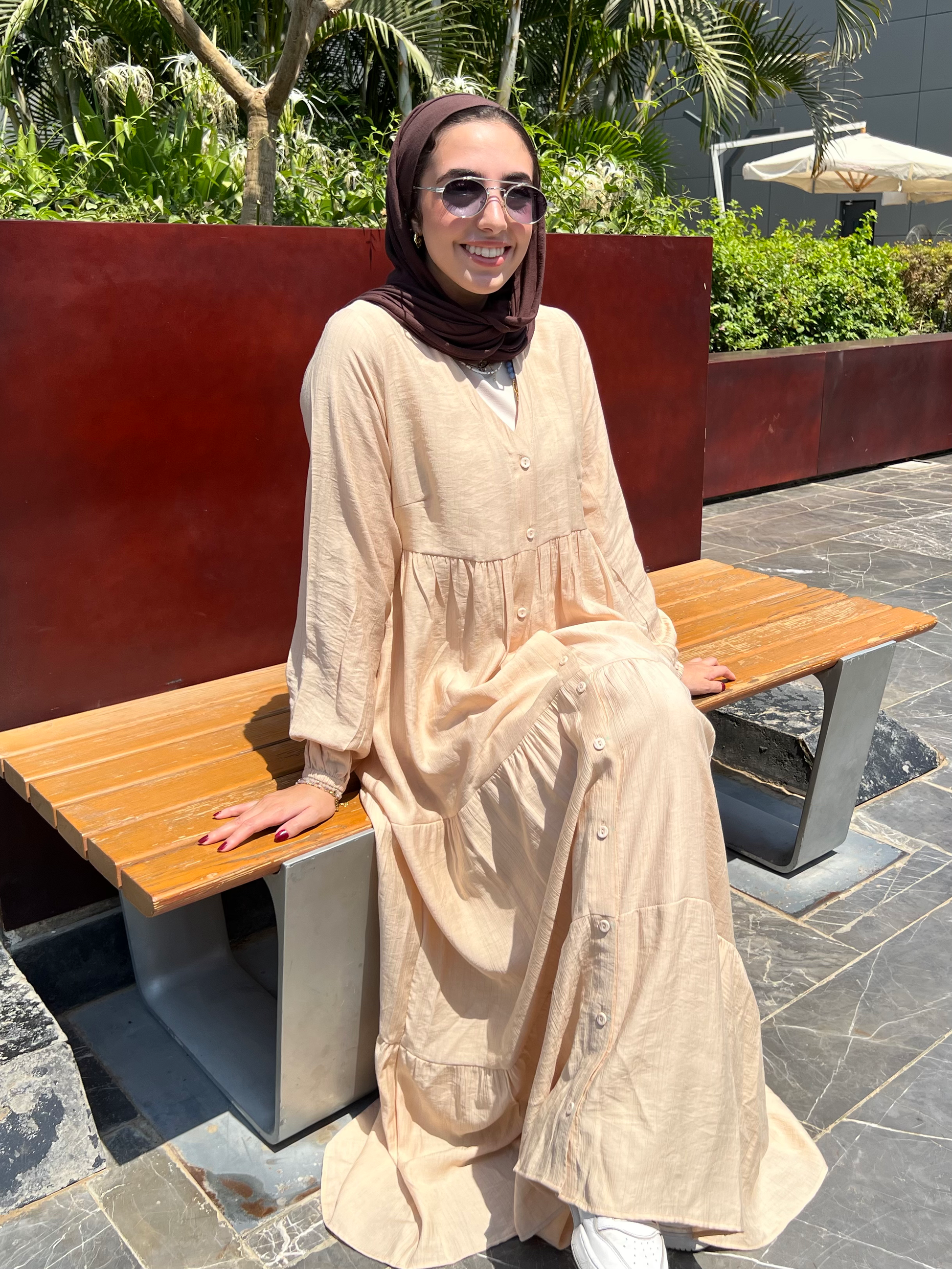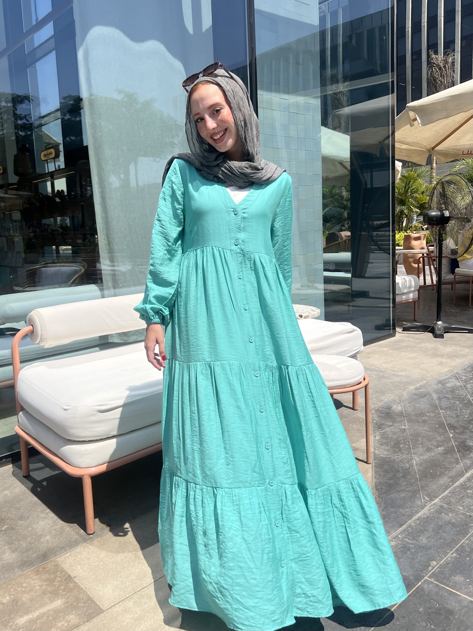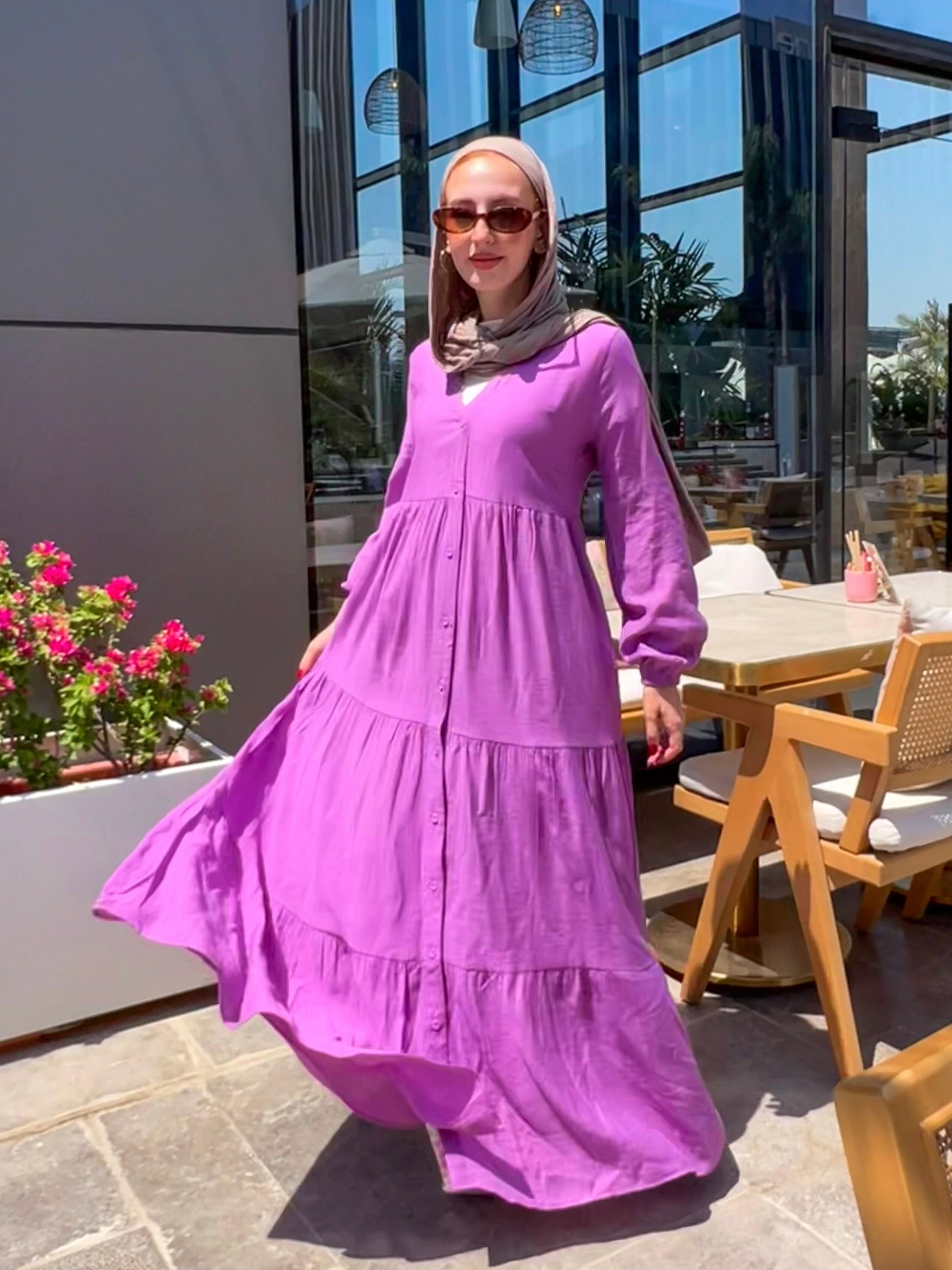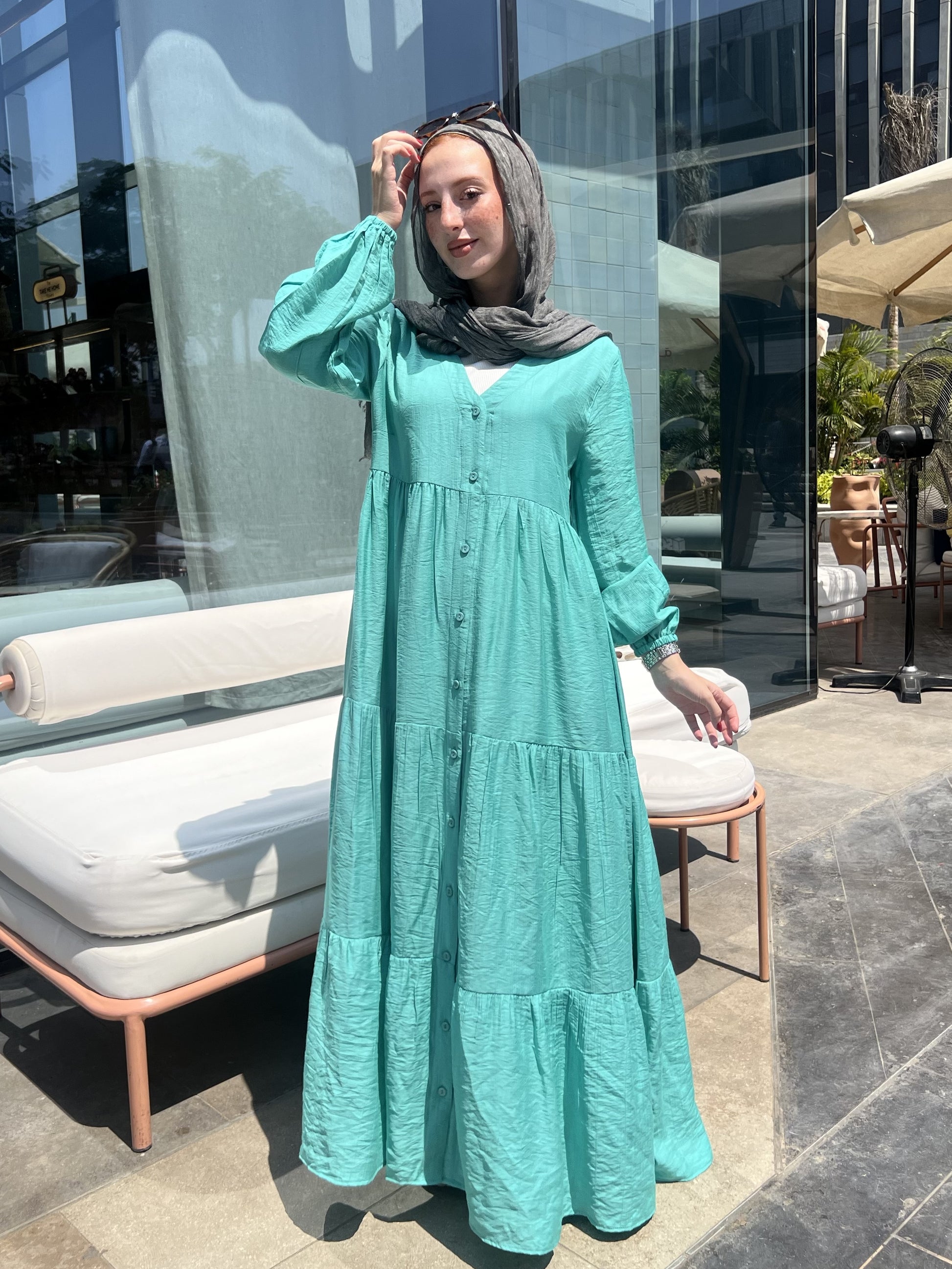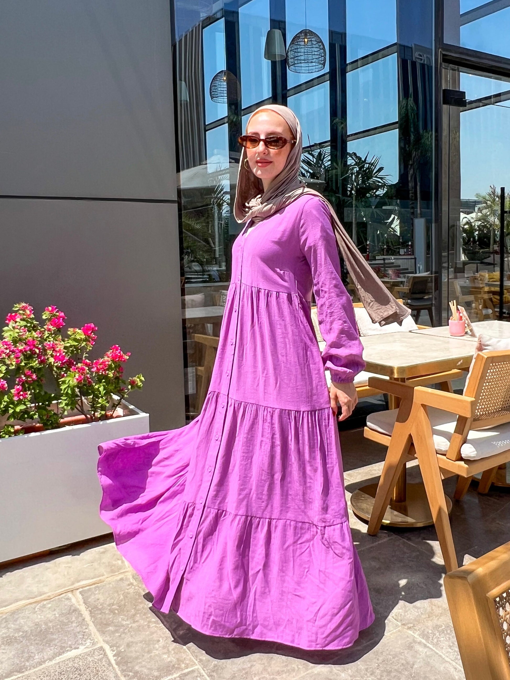 التصميم: فستان كتان ناعم سادة بأزرار أمامية – يتلبس مفتوح أو مقفول.